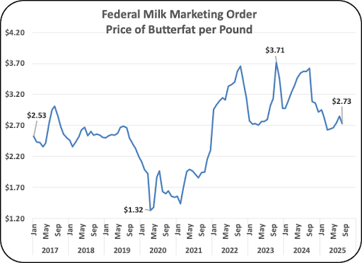 For four years butterfat has been the largest revenue source for dairy producers. The value of butterfat began increasing in 2022 and reached a record price of $3.71 per pound in late 2023. In 2024 and 2025 the price began declining (Chart I). Because butterfat is the largest contributor to producer and processor revenue, the changes are closely followed in dairy publications. The data in the charts below follow the changes in the many elements that can influence butterfat pricing. The pricing of butterfat is calculated from the wholesale prices of butter using USDA formulas. This post is an update to the July 23, 2025 post.