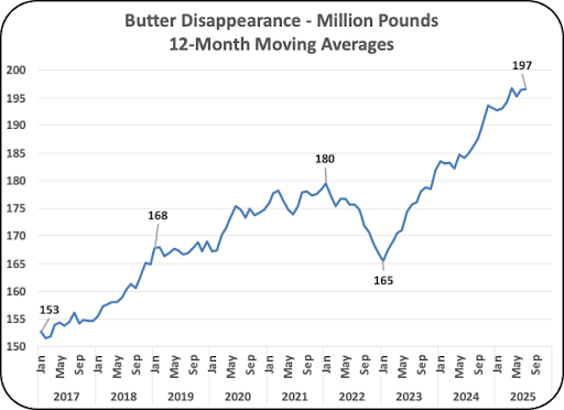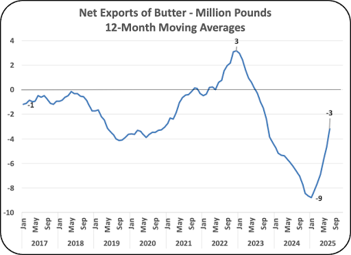 - The 12 month moving averages of butter net exports in 2024 through July 2025 range by 6 million pounds while the monthly data range by 26 million pounds.