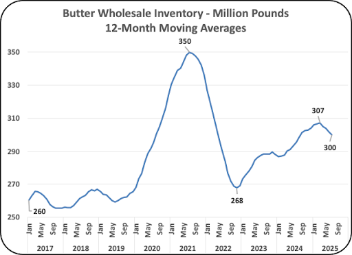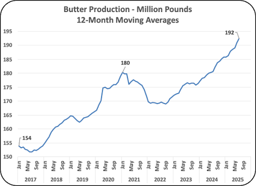 - The 12-month moving averages of butter exports in Chart IX show a similar pattern to the monthly exports in Chart VI but with a much smaller range. The monthly range in monthly exports in 2024 through July 2025 range by 16 million pounds in the monthly charts and range by 5 million pounds in the 12-month moving averages.