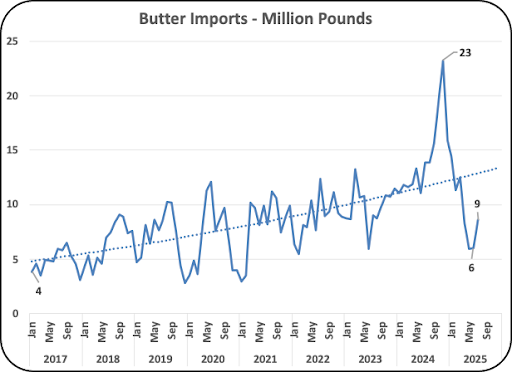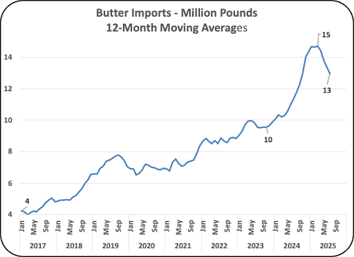 - The 12-month moving averages of butter imports in 2024 through July 2025 range by 5 million pounds. The monthly range of butter imports (Chart VII) is 17 million pounds.