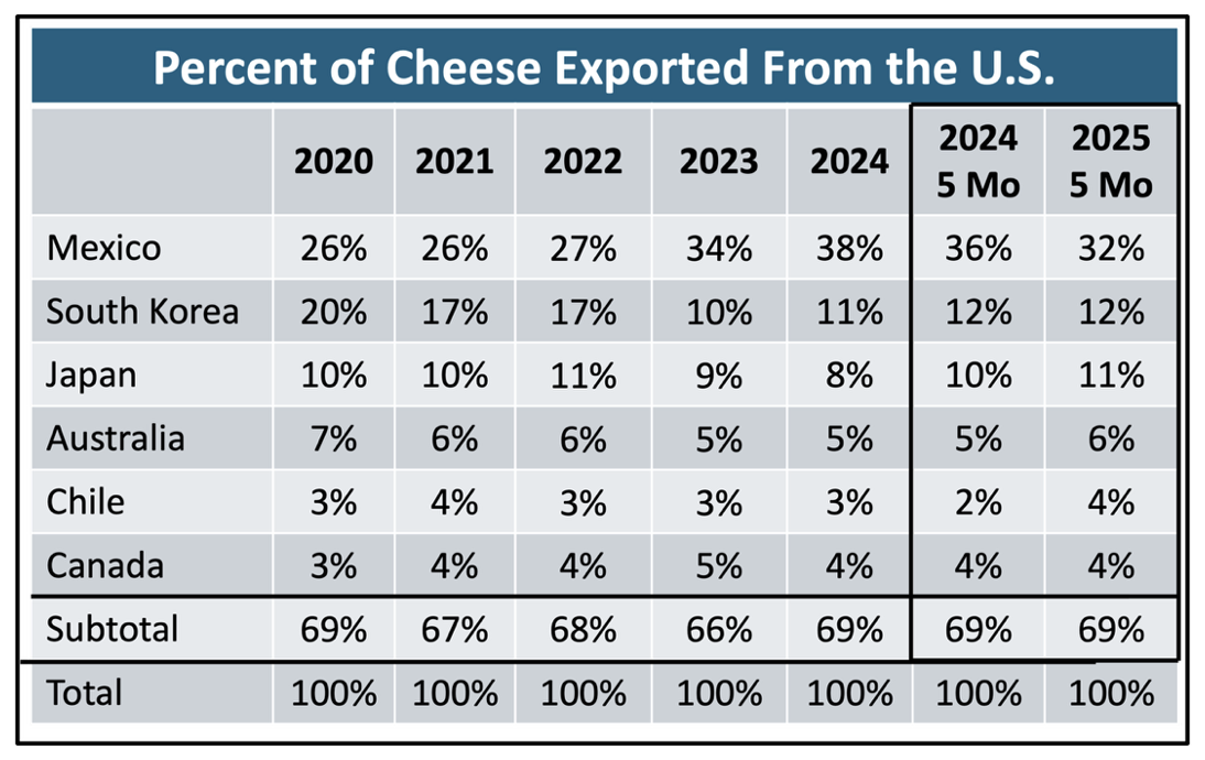 The two right hand columns in Table I compare the most recent exports of cheese in the first five months of 2025 compared to the first five months of 2024. Overall, the growth of cheese exports in 2025 YTD has grown nicely with a 7% increase. However, Cheese exports to Mexico have fallen by 7% in 2025 YTD. How much of the decrease in Mexico exports is influenced by trade and tariff negotiations?