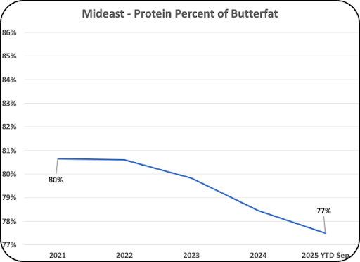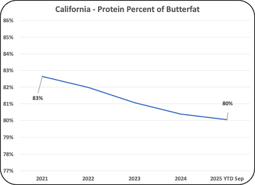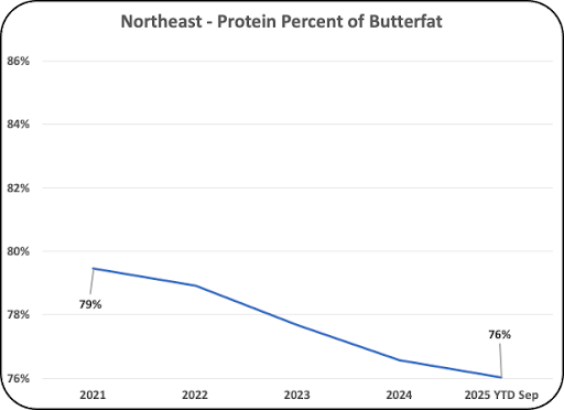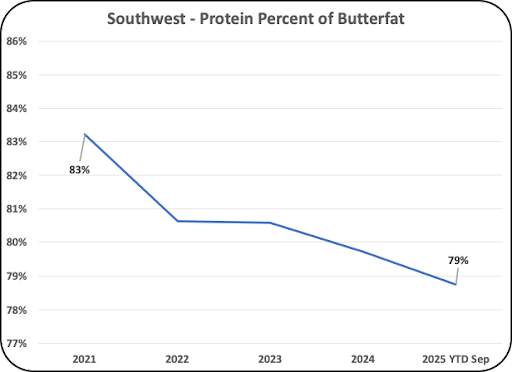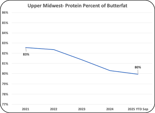 The data for 2025 is based on the first three quarters of the year. The fourth quarter always has the highest butterfat and milk protein components. However, that should not influence the ratios below.