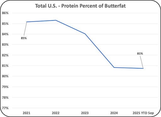 The change in the ratio of milk protein to butterfat is slowing down. However, the low ratio still means that there is a need to move butterfat from Class III to Class IV. Some of the slowdown in 2025 may be from the current movement of butterfat from Class III to Class IV.
