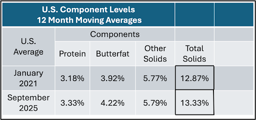More milk per cow is an important element in providing low-cost dairy products. Combining the increasing milk per cow with the increasing level of components in that milk expresses the impact of these two elements combined. Table I below shows the increase of higher components. Protein levels have increased by 5% and butterfat levels have increased by 8%. Other solids have increased only slightly.